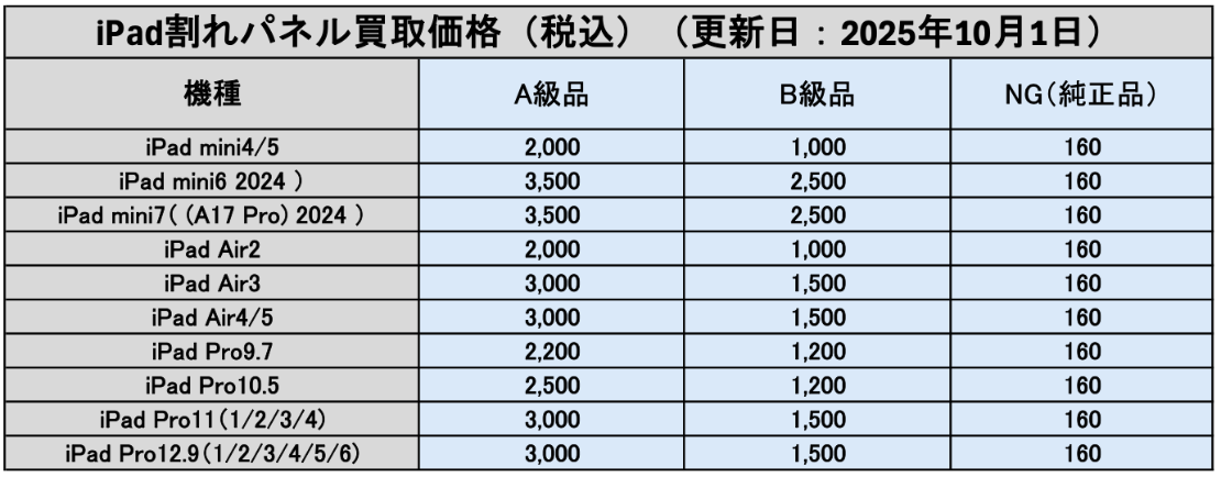 iPadは専用の表をご使用いただきますようお願いいたします。⏬iPad買取明細表.PDF(←こちらリンクとなります)EXCELデータ⏬